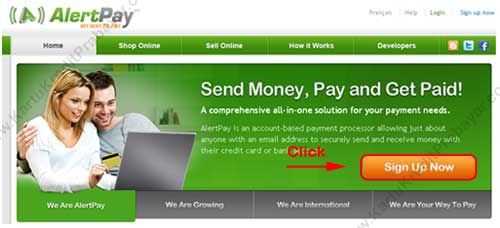 kemudian bagaimana cara daftar alertpay? langsung saja tanpa basa basi :Pertama anda kunjungi situs alertpay, setelah mengunjungi situs Alertpay maka langsung Tekan Sign Up Now sebelah kanan atas.