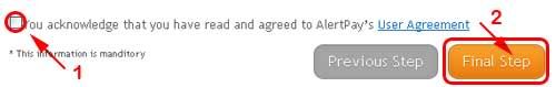 Dibawahnya lagi anda diminta tentang Third PartyInformation atau Informasi Pihak Ketika yang akan menggunakan account anda, apabila tidak ada pilih no, kemudian masukkan verifikasi kata yang muncul di layar dan berikan tanda centang pada I agree to Alertpay's User Agreement.