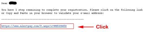 Langkah terakhir anda diminta untuk melakukan validasi email. Bukalah email anda yang digunakan untuk mendaftar Alertpay setelah itu klik link yang dikirimkan oleh Alertpay ke mail anda. Jika anda belum juga menerima email validasi dari alertpay anda tinggal menglik klik here pada menu validasi email di menu Alertpay tadi. contoh gambar :