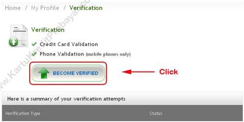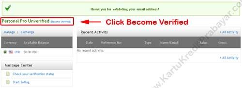 Setelah anda selesai memvalidasi email anda maka proses pendaftaran Alertpay sudah beres, anda tinggal Memverifikasi Alertpay anda, karena dalam tahap ini account alertpay anda belum terverifikasi jadi anda harus memverifikasi dengan cara mengirimkan dokumen data berupa Scanan KTP, SIM atau sejenisnya dan bisa dengan cara memasukkan no. telp untuk menverifikasi, Caranya klik Become Verified